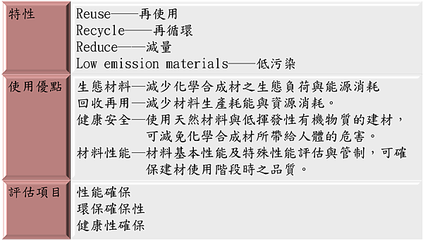 廿一世紀為綠建材的時代,綜合各國之綠產品標章或建材標章可了解目前國際間對於綠建材的概念可歸納為表1。