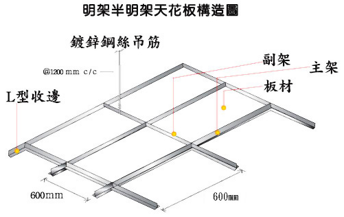 完成面水平放樣-按裝收邊-按裝吊筋-懸掛主架-按裝副主架4呎-按裝副主架2呎-放置板材
